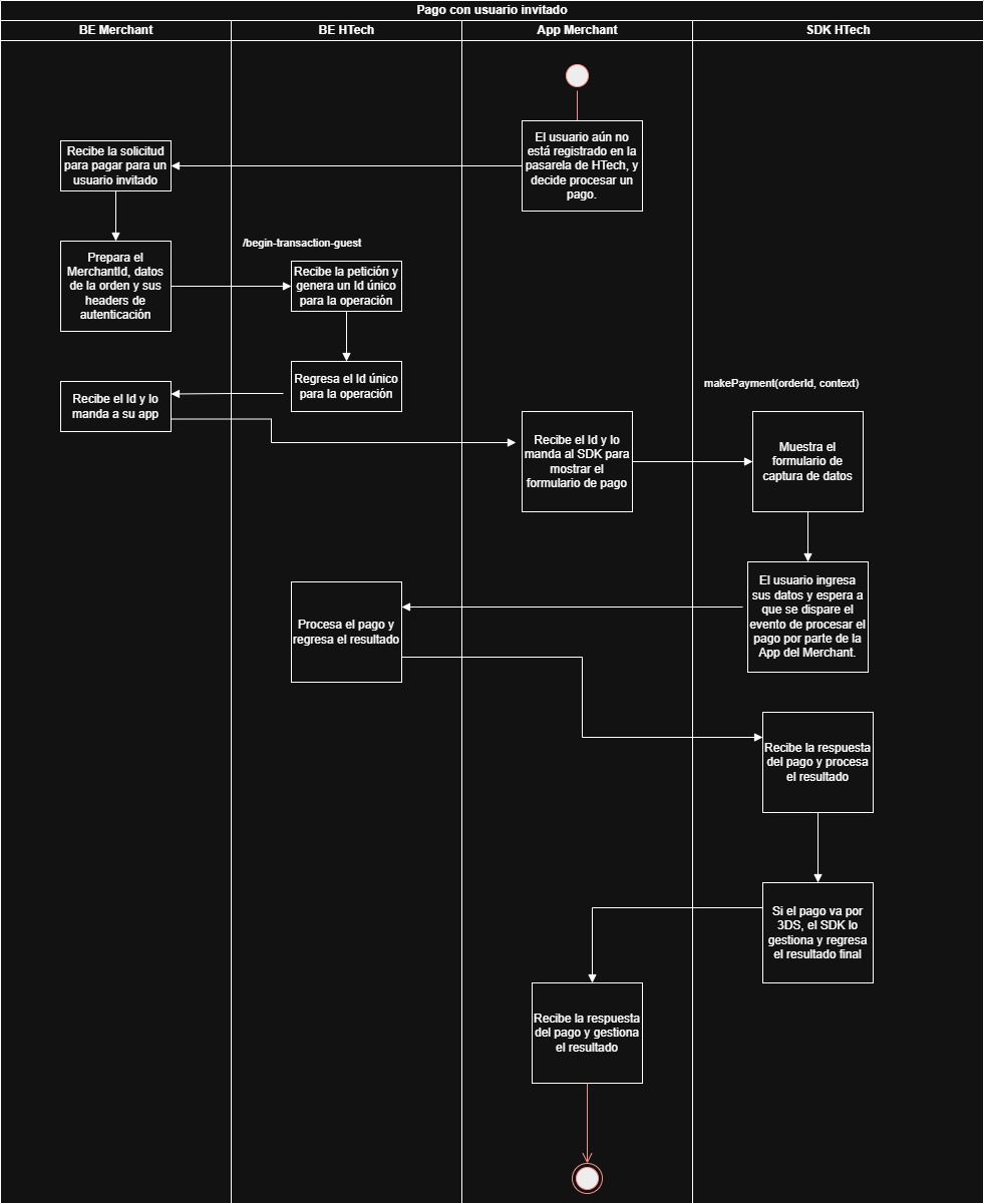 A continuación se describe el proceso para realizar un pago con un usuario invitado, en donde pueden intervenir las siguientes entidades: