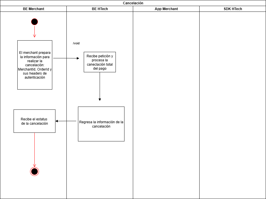 A continuación se describe el proceso para procesar una cancelación de un pago previamente exitoso, en donde pueden intervenir las siguientes entidades: